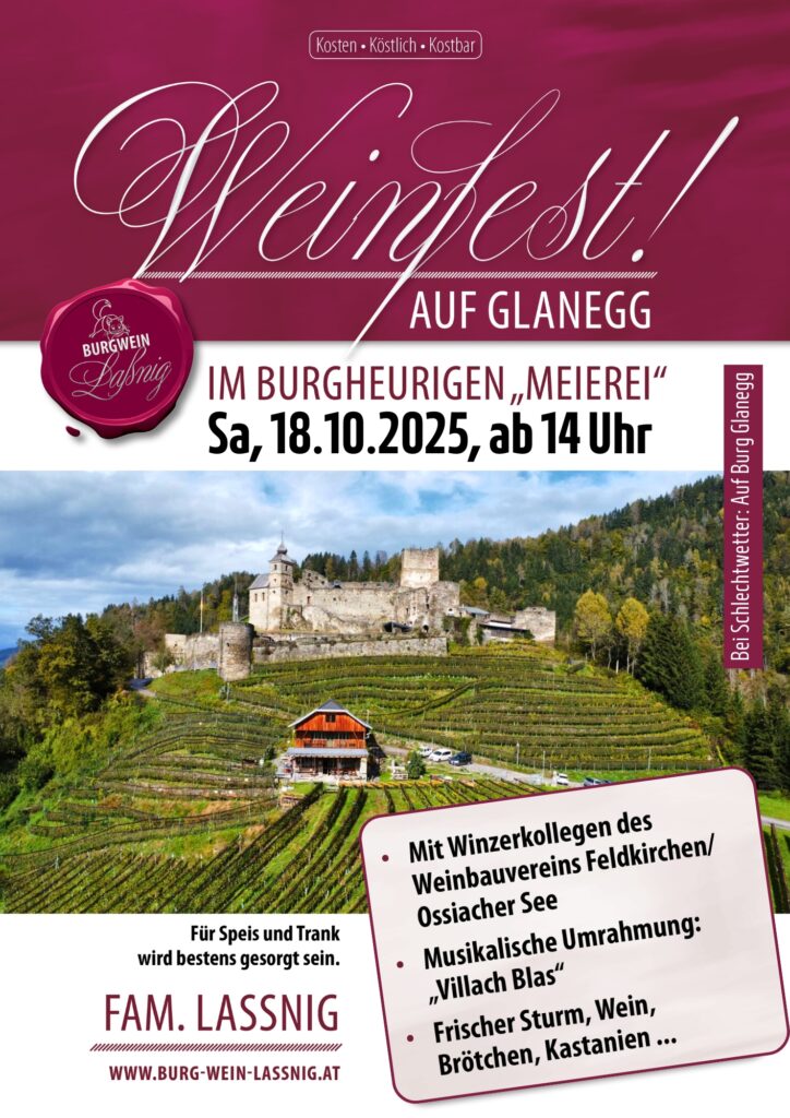 Die Familie Laßnig vom Burgwein Glanegg lädt, gemeinsam mit dem Weinbauverein Feldkirchen-Ossiacher See, auch heuer wieder herzlich zum traditionellen Weinfest in der Meierei ein.