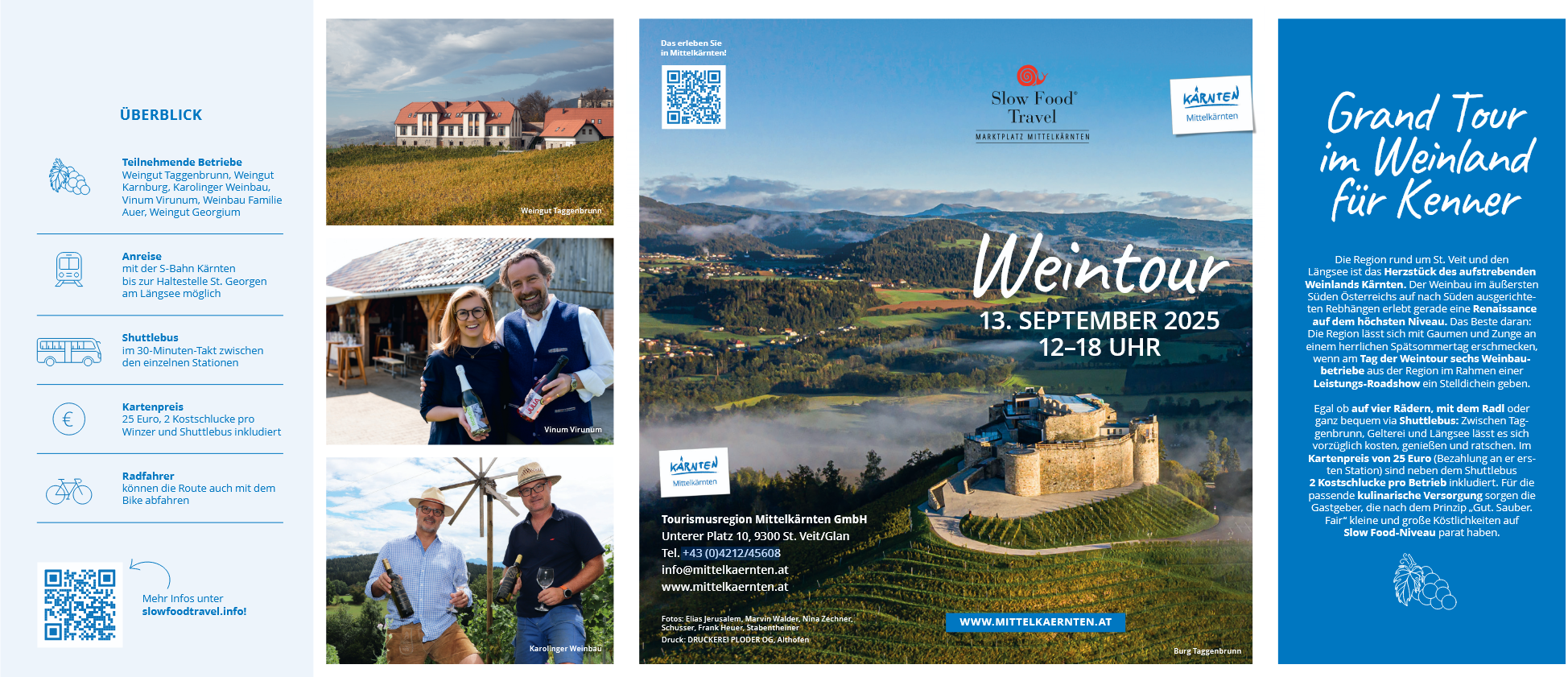 Egal ob auf vier Rädern, mit dem Radl oder ganz bequem via Shuttlebus: Zwischen Taggenbrunn, Gelterei und Längsee lässt es sich vorzüglich kosten, genießen und ratschen. Im Kartenpreis von 25€ (Bezahlung an der ersten Station) sind neben dem Shuttlebus zwei Kostschlucke pro Betrieb inkludiert. Für die passende kulinarische Versorgung sorgen die Gastgeber, die nach dem Prinzip ,,Gut. Sauber. Fair'' kleine und große Köstlichkeiten auf Slow Food-Niveau parat haben.
